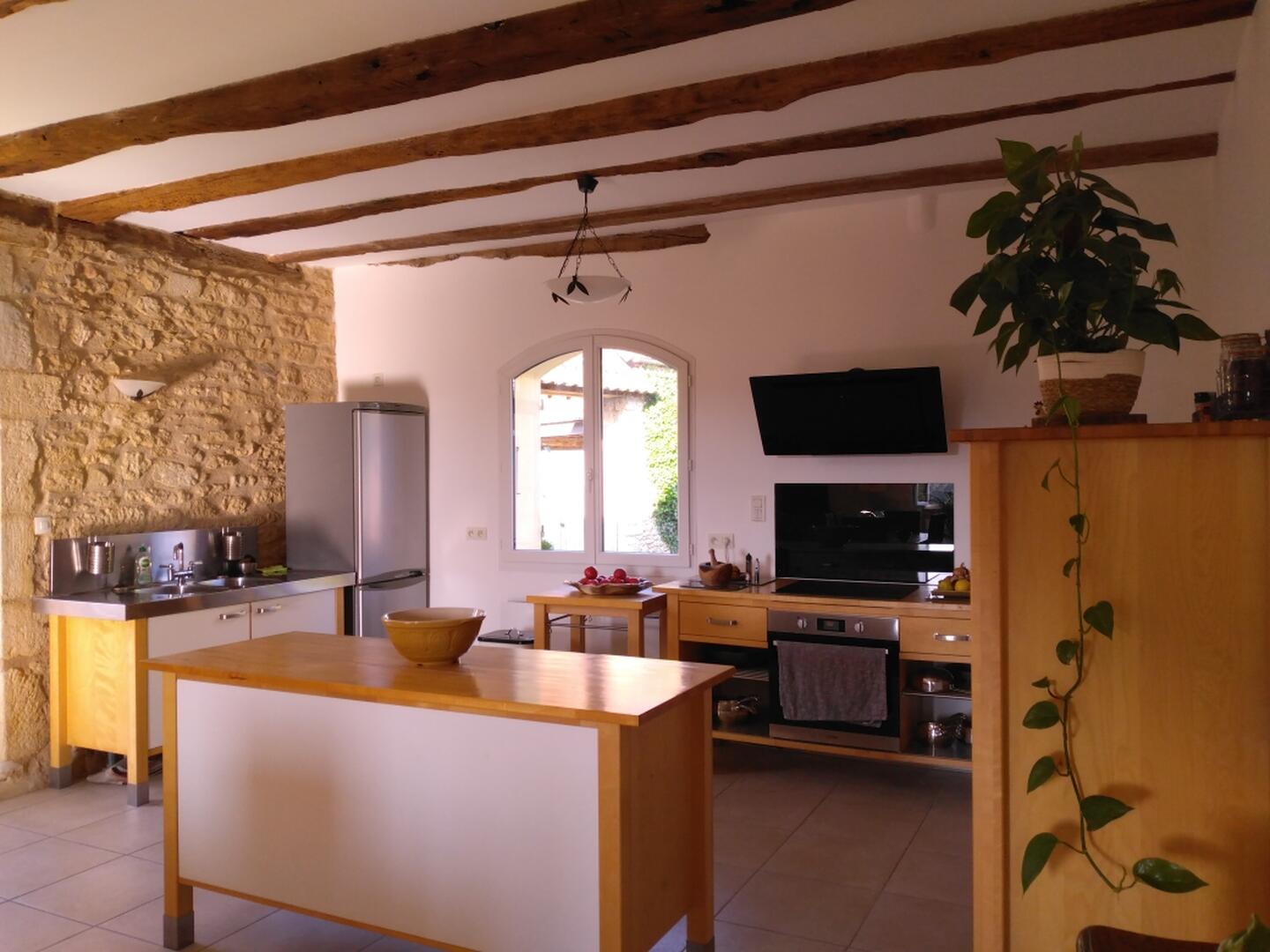 - Pièce(s) à vivre cuisine équipée ouvrant sur séjour de 56 m² avec un poêle à bois.