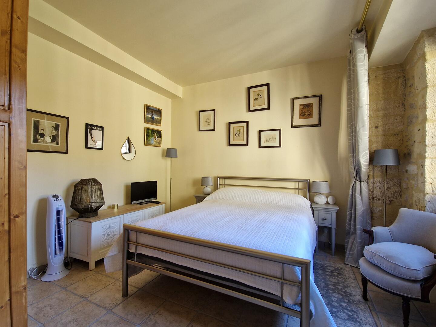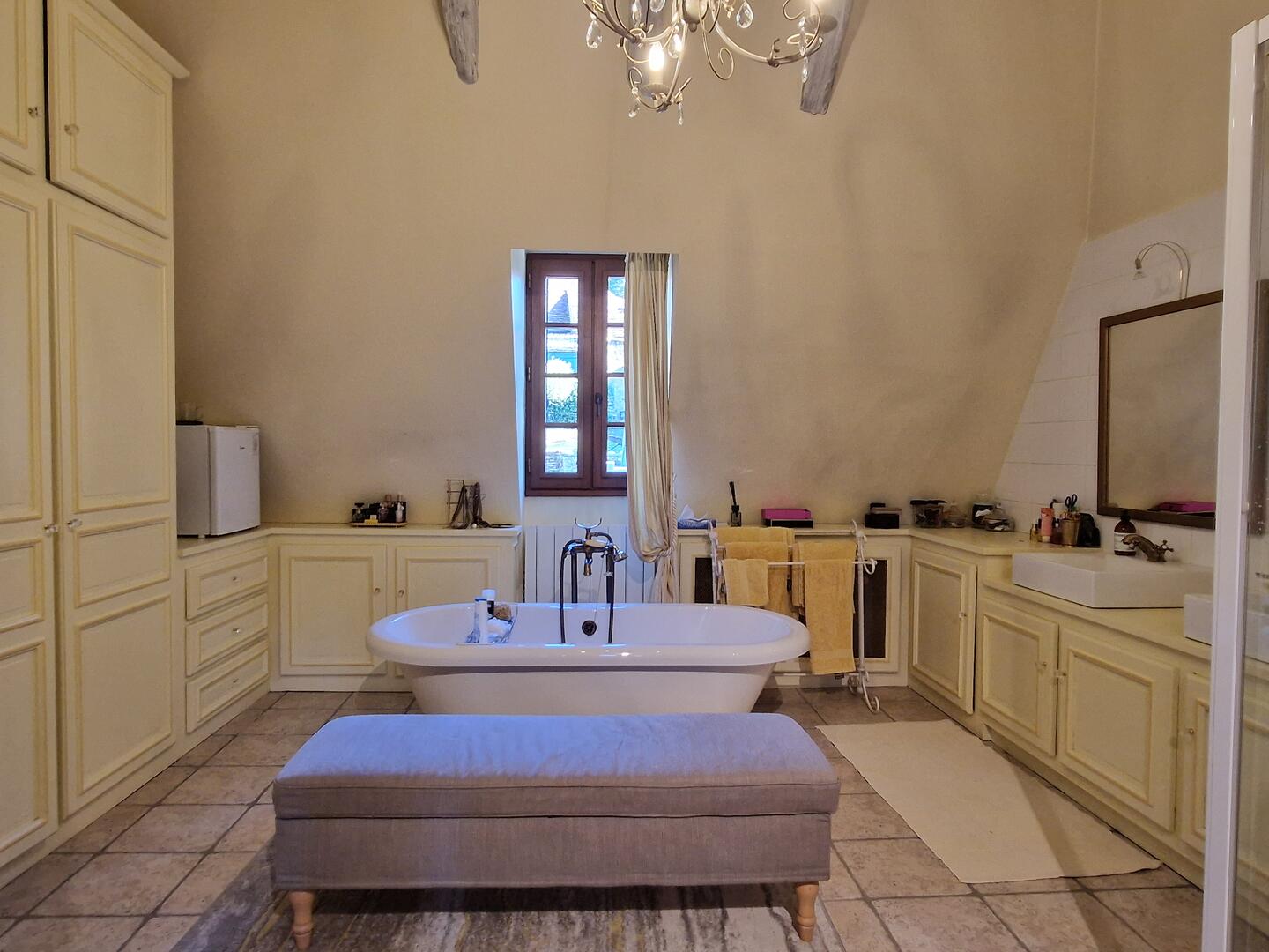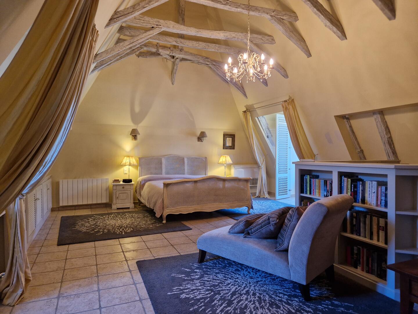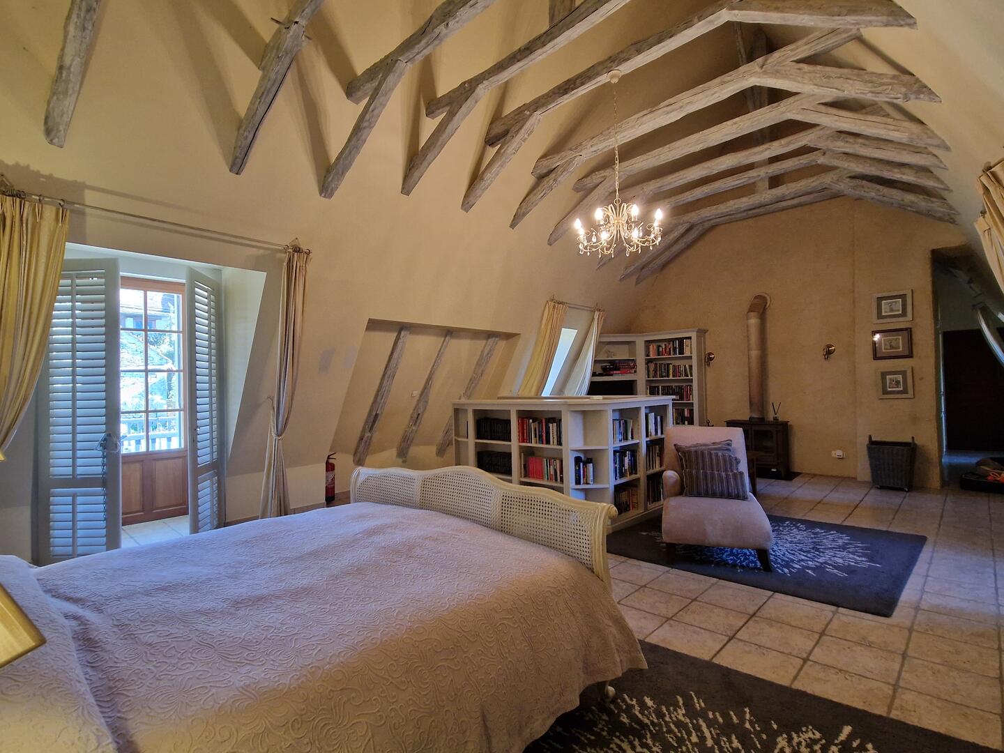 - Chambre(s) 45 m2 Chambre de maître vaste volume charpente cathédrale aux poutres apparentes, larges rangements, placards, poele, Climatisation. Porte vers le jardin - salle de bains ensuite 16m2