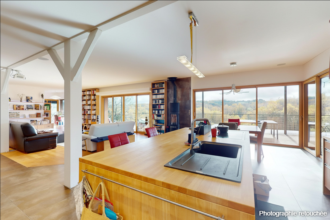 En Périgord Noir, non loin de Montignac-Lascaux, de ses commerces, services et écoles, sur les hauteurs, au milieu de la forêt, dans un environnement calme, sans aucune nuisance sonore et visuelle, venez découvrir au bout d'un chemin éclairé sur toute la longueur, cette grande demeure d'architecte en bois. Construite en 2015 par un artisan ferronnier, vous trouverez dans cette réalisation des éléments de très haute qualité: bardage des murs en Doussié, bois africain d'exception, isolation en laine de bois et chanvre....De toutes parts, elle s'ouvre sur la nature grâce à de grandes ouvertures, et est ainsi très lumineuse. L'entrée s'ouvre sur une immense pièce de vie avec cuisine ouverte, séjour et coin bureau de plus de 90 m², avec des baies vitrées à galandage donnant sur une magnifique terrasse d'environ 180 m² . 2 chambres avec salles de bains complètent l'espace habitable. En rez de jardin se trouvent un grand préau , une salle de sport, une grande buanderie. Ce site de plus de deux hectares bénéficie d'un environnement exceptionnel et protégé et vous offrira un cadre apaisant devant une vue à couper le souffle! Les informations sur les risques auxquels ce bien est exposé sont disponibles sur le site Géorisques : www.georisques.gouv.fr