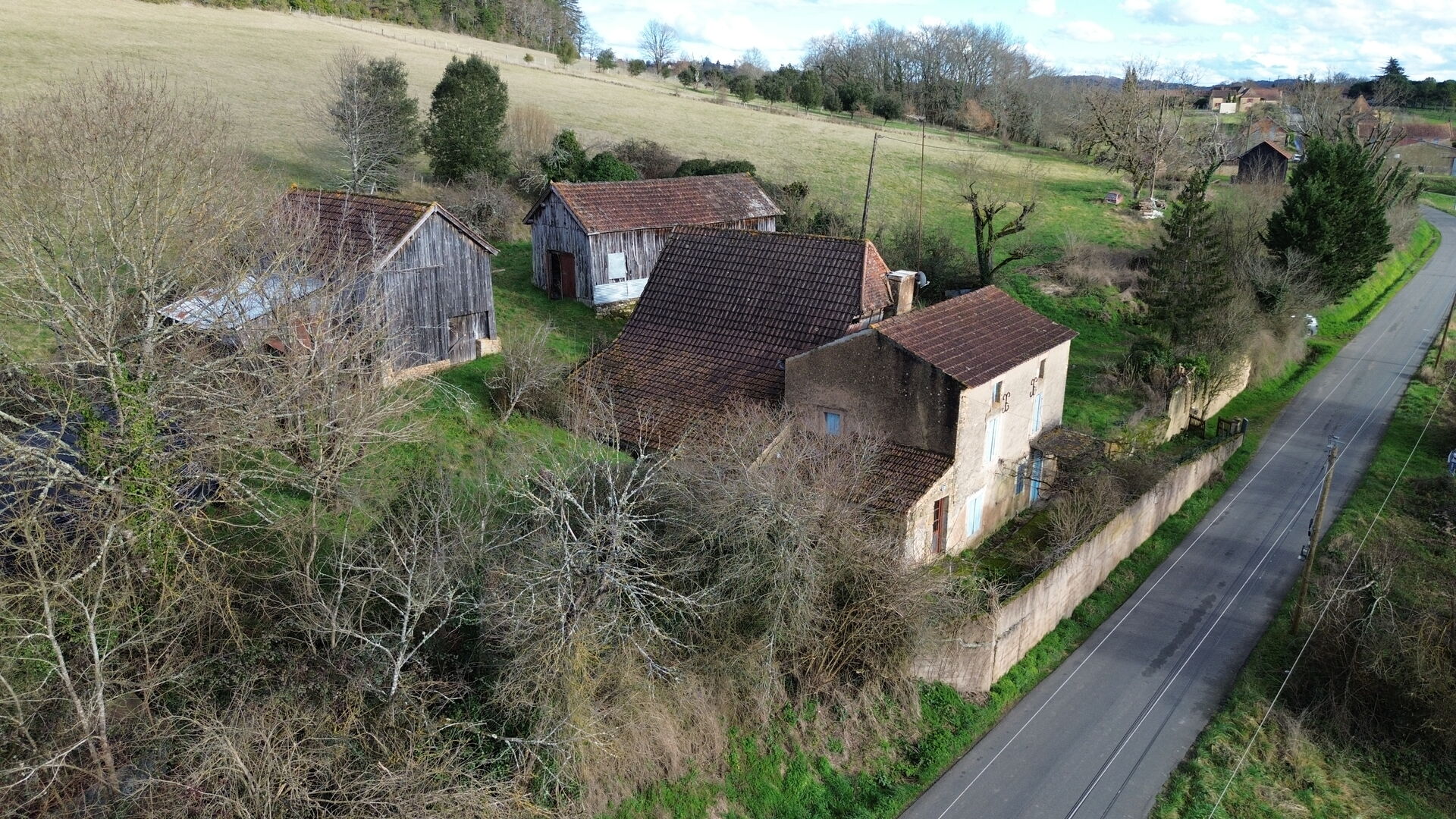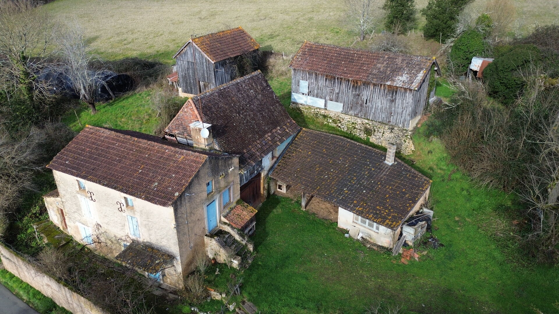 Env 2 km du village, non loin de la rivière et non inondable. Typique petit corps de ferme à restaurer comprenant ancienne Maison de 5 pièces, Grange attenante, diverses petites dépendances et deux hangars à tabac bardés de bois. entourée de son terrain en jardin, cour, prairie et colline arborée d'env 3 ha 23. Les informations sur les risques auxquels ce bien est exposé sont disponibles sur le site Géorisques : www.georisques.gouv.fr