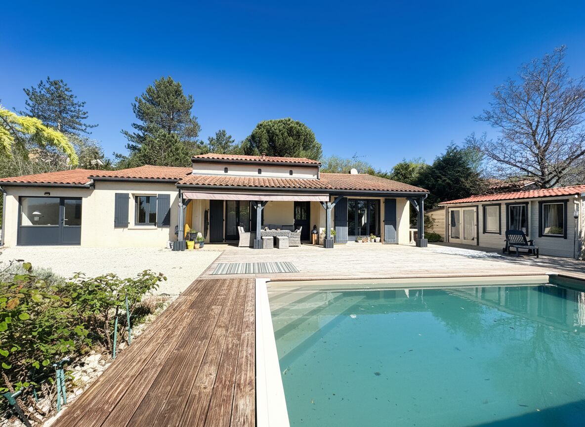 A 20 minutes au Sud de Sarlat, proche de Castelnaud, en position dominante et vue dégagée , maison de plain pied de 117 m2 composée de 3 chambres, 1 salle de bains avec wc, 1 wc indépendant , une suite parentale avec 1 salle d'eau, un coin buanderie, une pièce à vivre avec poêle à granules, cuisine indépendante le tout sur un jardin arboré de 3444 m2 agrémentée d'une piscine chauffée, d'une grande terrasse bois et d'un chalet avec local technique et atelier ( cabanon isolé -possibilité de faire une chambre d'appoint) Double vitrage, chauffage électrique + poêle à granules, fosse septique Les informations sur les risques auxquels ce bien est exposé sont disponibles sur le site Géorisques: www.georisques.gouv.fr