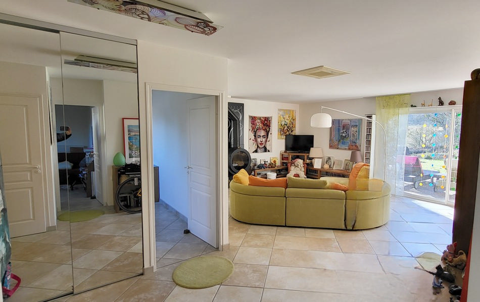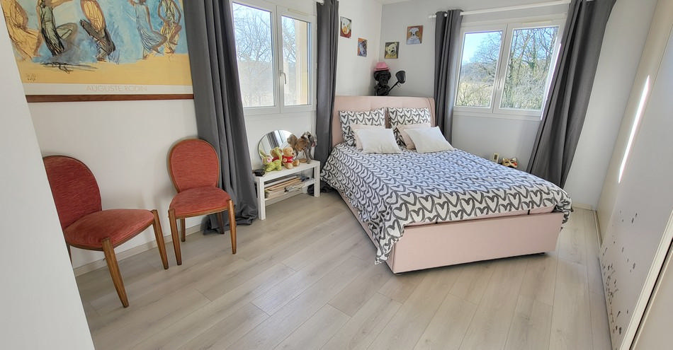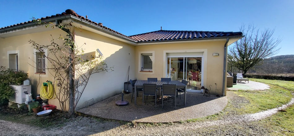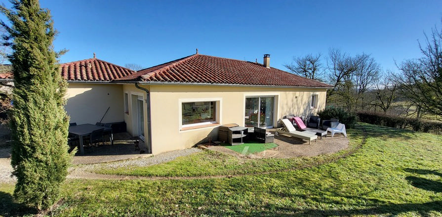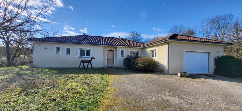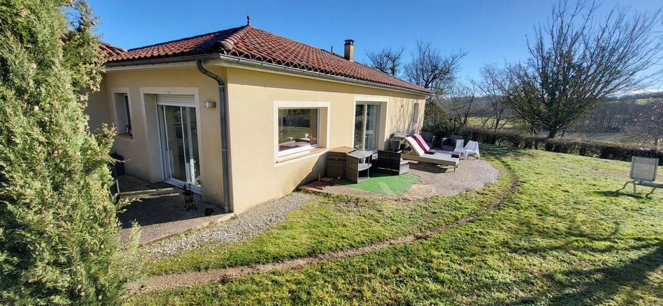 Dans un hameau sur les hauteurs de la Bouriane, au calme sur un jardin en partie clos de 2500 m² avec jolie vue sur la campagne, cette agréable et lumineuse Maison idéalement agencée de plain-pied offre 125 m² habitables, complétés par une dépendance avec chambre d'amis. La maison principale: Entrée sur séjour de 40 m² avec poêle bois - vue sur le jardin - ouvert sur une cuisine entièrement aménagée de 24 m², bureau, 2 chambres avec salle d'eau privative (15 et 26 m²),wc, cellier, buanderie, garage. Chauffage par plancher rayonnant électrique, climatisation réversible, poêl bois. Double vitrage. Fosse septique. Une dépendance aménagée en chambre d'amis de 22 m² avec salle d'eau. Pigeonnier en pierre. Abris jardin. Les informations sur les risques auxquels ce bien est exposé sont disponibles sur le site Géorisques : www.georisques.gouv.fr