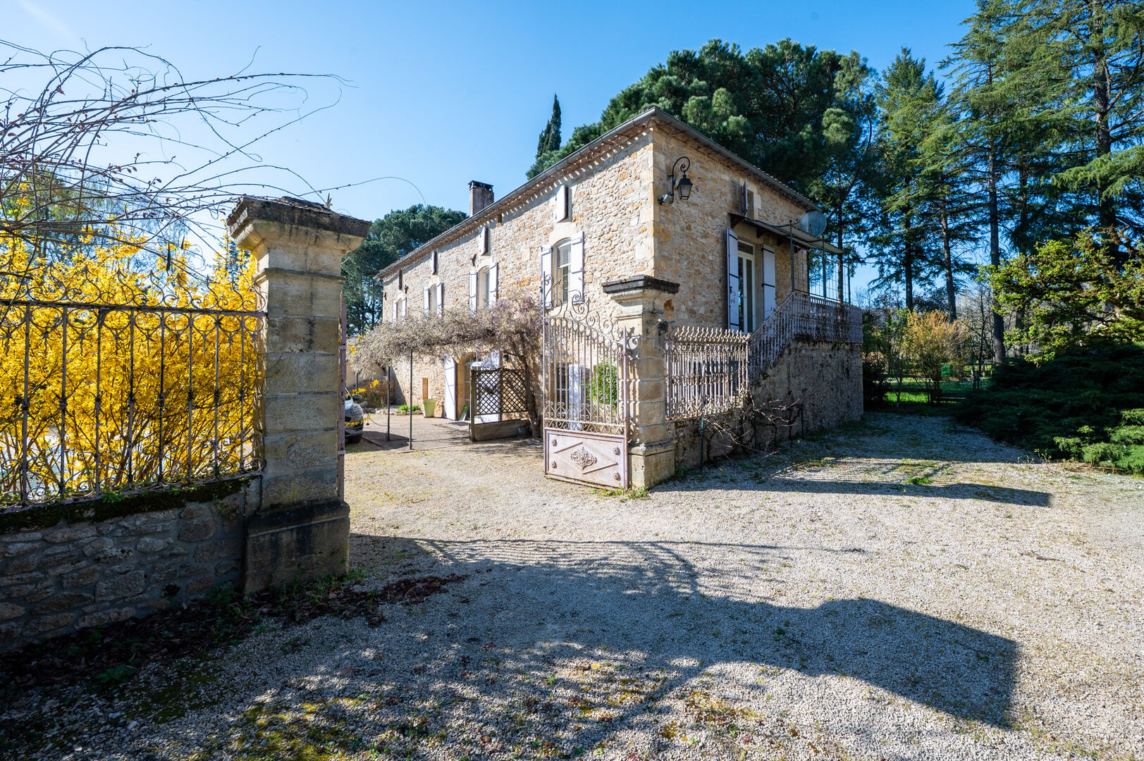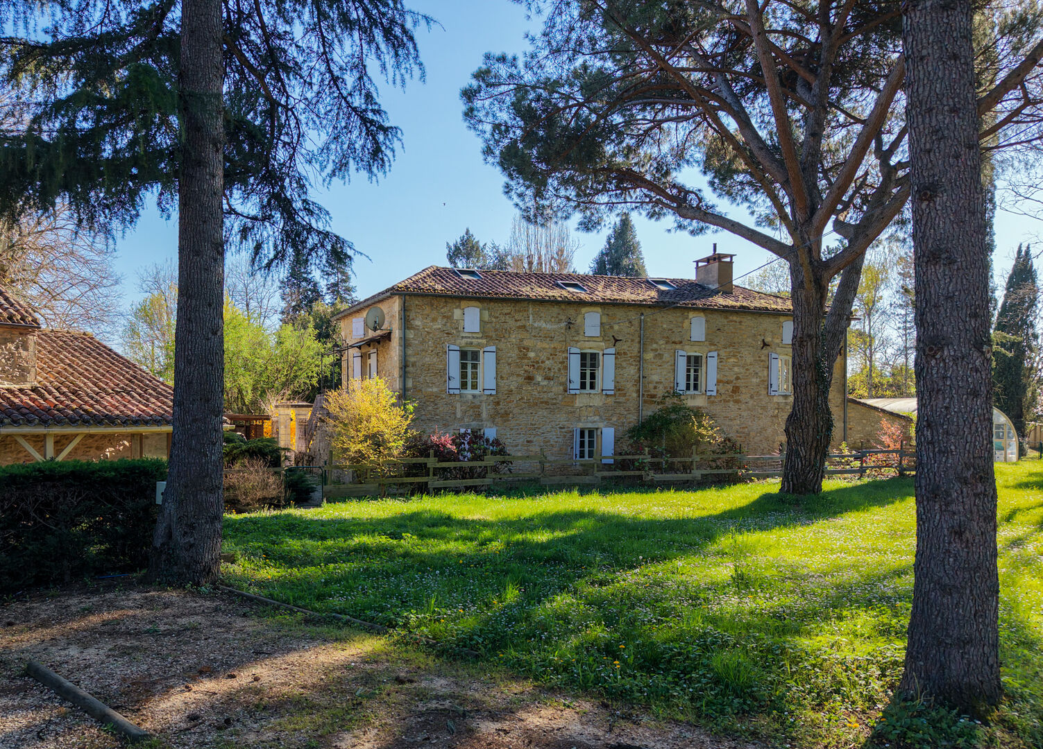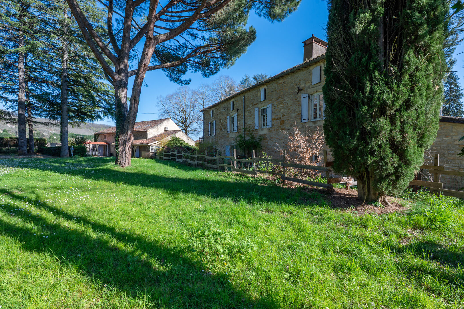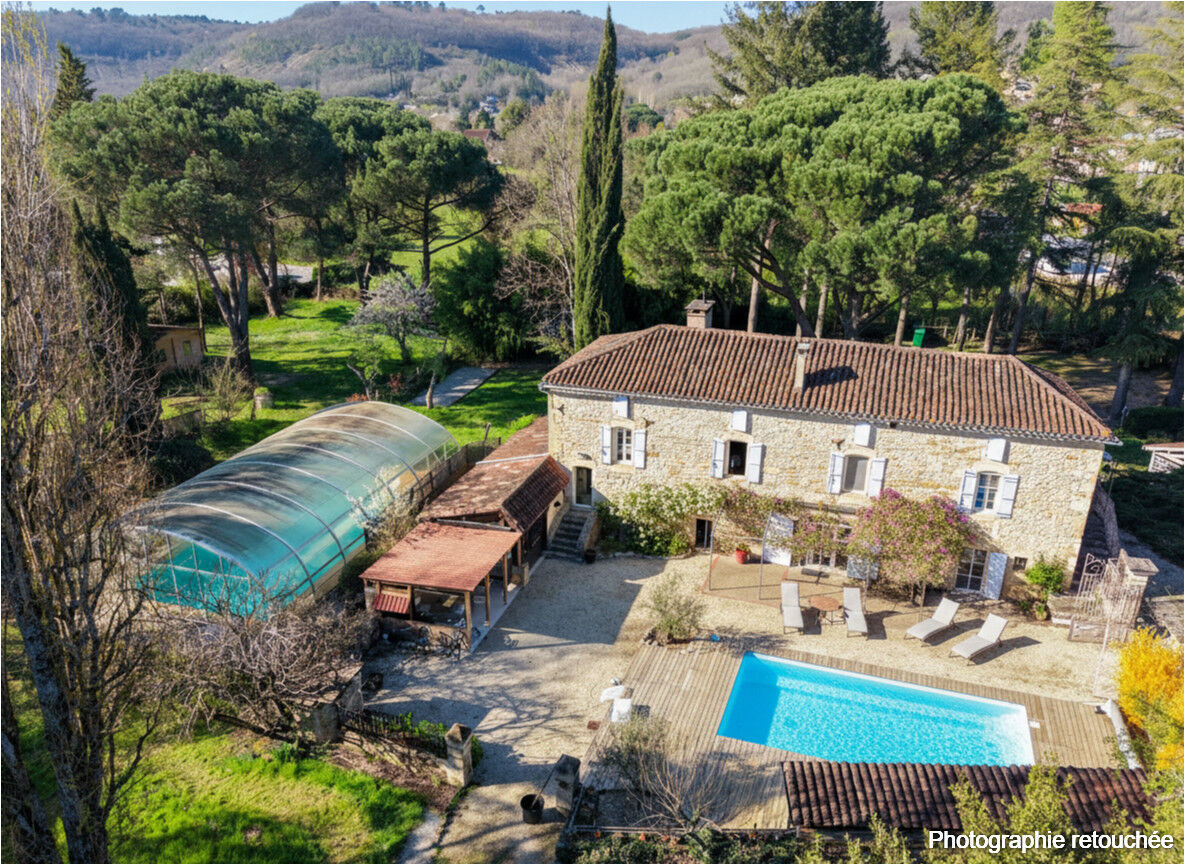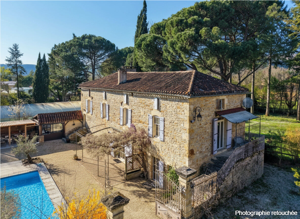 Set within a magnificent park planted with majestic trees, in the heart of the Lot Valley, this fully renovated character property offers an exceptional living environment, elegantly combining the authenticity of stone with modern comfort. Offering approximately 530 sqm of living space, the property comprises a main residence full of character and an independent guest house dedicated to hospitality, providing strong income potential in a highly sought-after tourist area. From the moment you arrive, the main house impresses with its charm and high-quality features. Behind a large entrance gate, the inner courtyard reveals an elegant 18th-century stone building enhanced by a wisteria-covered pergola, an 8 x 4 m swimming pool surrounded by a wooden terrace, and a peaceful, relaxing atmosphere. A summer kitchen and a veranda seamlessly extend the living areas դեպի the outdoors. The ground floor features a refined travertine entrance with bespoke storage, a spacious 26 sqm office filled with natural light thanks to a glass roof, a laundry room, a separate WC, and a boiler room equipped with a remotely controlled Ökofen Pellematic pellet boiler. A welcoming dining room and a superb fully fitted Schmidt kitchen, opening onto the veranda and outdoor areas, complete this level. Upstairs, a bright mezzanine hosts an office space. The living room, with fireplace and pellet stove, opens onto a cozy reading area, offering approximately 40 sqm of living space. Two comfortable bedrooms share an elegant bathroom with a shower. The converted attic provides a large leisure area, a dressing room, two additional bedrooms, and another bathroom. The independent guest house, approximately 231 sqm and sold unfurnished, has been designed for high-quality hospitality use. It features a warm reception room with a pellet stove, extended by a lounge area under a glass roof offering stunning views over the park. The open kitchen, equipped with professional-grade appliances including pizza ovens and a range cooker, allows for catering or event hosting activities. Spread over two levels, four studios of around 30 sqm each offer complete amenities including bedroom, kitchenette, shower room, separate WC, and reversible air conditioning. Two additional suites complete the property, one of which is accessible to people with reduced mobility, meeting modern hospitality standards. The outdoor areas have been designed as a true space for relaxation and leisure, featuring a second covered swimming pool measuring 12 x 8 m, a pétanque court, an ornamental pond, and extensive shaded areas beneath majestic conifers. Several outbuildings enhance the property, including a carport, a recent 50 sqm wooden chalet housing the pool technical room, a workshop, storage areas, and a natural spring. In terms of comfort, the property benefits from high-performance equipment including a pellet boiler, pellet stoves, and reversible air conditioning, ensuring excellent comfort throughout the year. This rare property stands out for its charm, generous volumes, quality renovation, and immediate potential for tourism or event-based activity, while preserving complete privacy for private use. Information regarding the potential risks to which this property is exposed is available on the Géorisques website www.georisques.gouv.fr